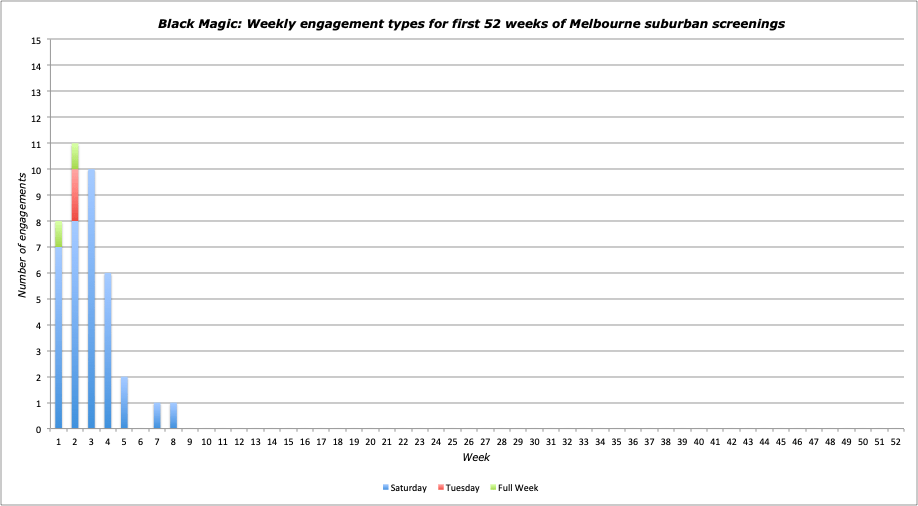 NOTES: Orson Welles had a lot of fun as Cagliostro and audiences would have been entertained by this impressively designed and told costume noir that accompanied Ma and Pa Kettle on its suburban run. Its five first bills were with other features. All done after week eight, Black Magic was top ranked for Saturday nights as a percentage of its total engagements (89.74%). Only a small number of engagements outside Hoyts.