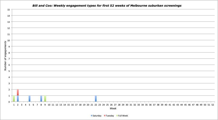NOTES: This novelty item (with an all-bird cast) definitely catered for the niche audience during its run at the Savoy. Appealing to the suburbs was always going to be difficult, especially after school holidays had finished, which accounts for its mere seven suburban observations.However, it is likely that Bill and Coo did find some favour as a Saturday matinee item, where it would have best been appreciated. Metrics-wise it did rank third as the most travelled on a per-engagement basis.