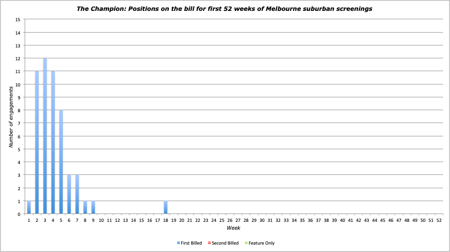 NOTES: A supreme performer for Hoyts, ranking highly on the Saturday night circuit and top billed on every occasion. Considering its decent PPE score it could have been given a few more plays (only three engagements after week 7). A mixture of supporting features, with Holiday in Havana gaining the most pairings.