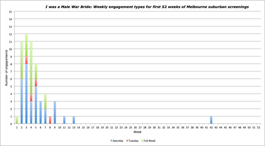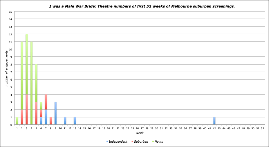 NOTES: One of the year’s strongest performers. In terms of exhibitor faith I Was a Male War Bride ranked third amongst all comedies and fifth amongst all films distributed through Hoyts’ suburban arm. For such a popular feature its theatrical life was mostly confined to its first ten weeks, only appearing a further three times in the first year of its suburban release.
