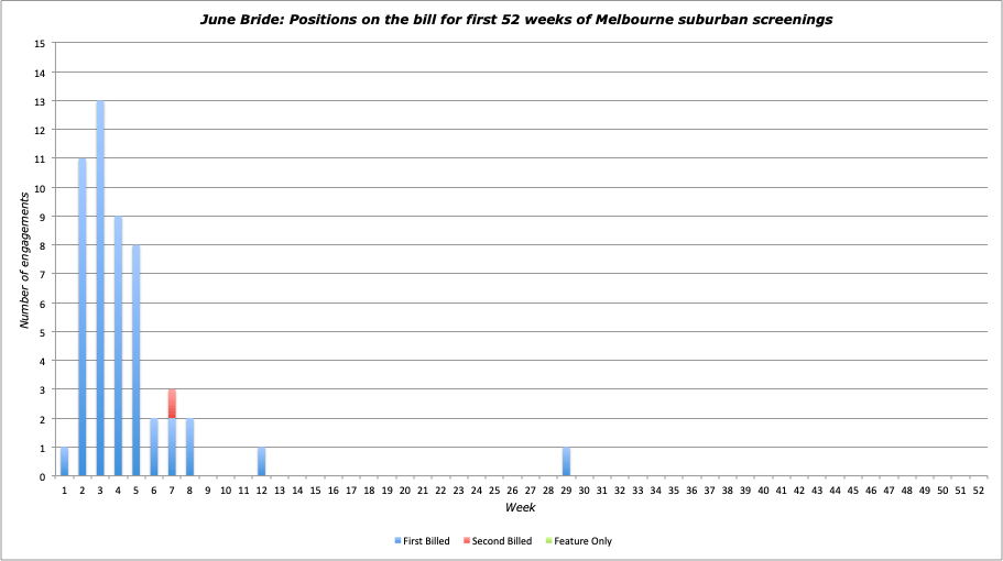 NOTES: Another mid-tier performer for Hoyts, enjoying top billings but as it was near equally split between Saturdays and Tuesdays its EF points were reduced. Intriguingly, it had one of the higher number of Suburban Theatre plays, yet only a couple of runs in Independent Theatres. For the majority of its engagements it was paired with the British crime drama My Brother’s Keeper.