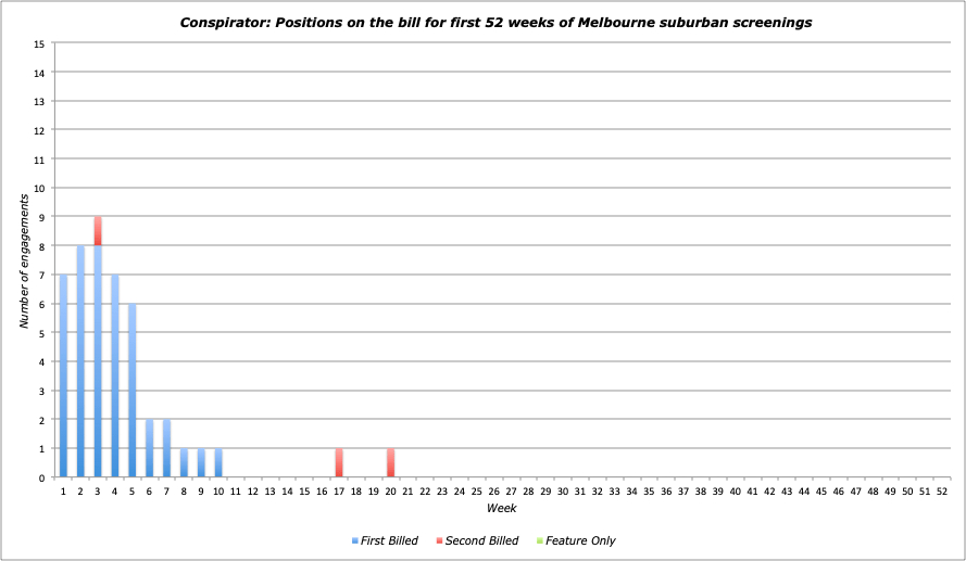 Notes: Purportedly a flop for MGM, this British-US espionage drama was still a hit with exhibitors in Melbourne, racking up a massive 365 EF points for a 27th place ranking. A large number of weeks aided the score. Almost always had its city support – Scene of the Crime – also for the suburban ride, although it took the secondary role to Take me out to the Ball Game in its final two plays.