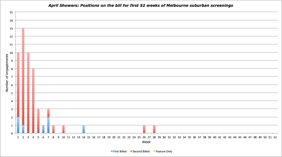 Notes: A Warners musical was teamed with a Fox one for suburban release, with the former in the support role in a case of the distributor not particularly diversifying their audience. In this case it was April Showers that came off second best, relegated to second feature in most situations. High on support roles (39th overall) but plenty of Saturdays (16th overall) raised it just into the top half of EF rankings.
