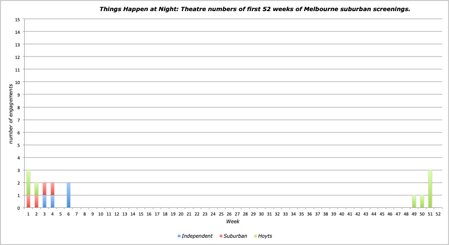Notes: British fantasy quickie about a possessed girl received three bookings through Hoyts in its first fortnight before the chain handballed it to Independent and Suburban theatres to use as supports until its 49th week when Hoyts picked it up again (it was observed playing after a year in suburban release). Very low on most metrics due to scant release pattern, but 23rd on average distance travelled per engagement.