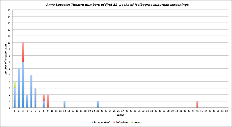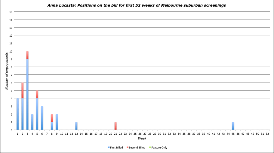 Notes: Noir-ish Columbia drama premiered in a Hoyts city venue then experienced a rather odd release, playing at both Hoyts’ Memorial and Union’s Astor in its first up suburban week, plus only two other Union houses in its third week it had widened to a total of ten theatres – a pattern rarely seen on the Union track. Yet, although enjoying a hefty number of weeks (as per Union standard) it played more on Saturdays, thus keeping its EF score to 236 points (and sneaking into the top 100). A good, second tier result on the Hoyts circuit, but middling on Union’s for a top-lining product.