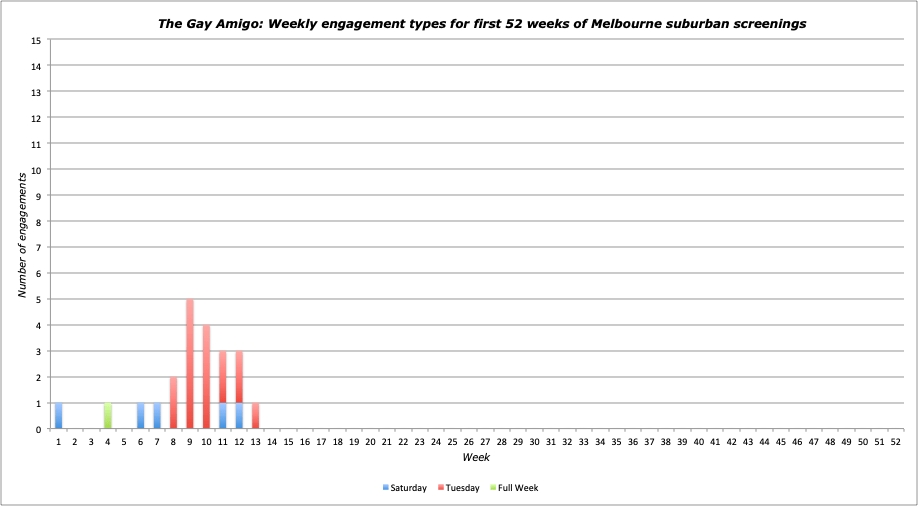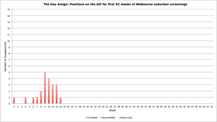 Notes: A Cisco Kid entry that was better suited to the Saturday matinee slots, this appeared to be abandoned early by Hoyts before, in its 9th week being dusted off to support Impact for a number of its screenings. Mostly screened on Tuesday nights and always in support its numbers were feeble.