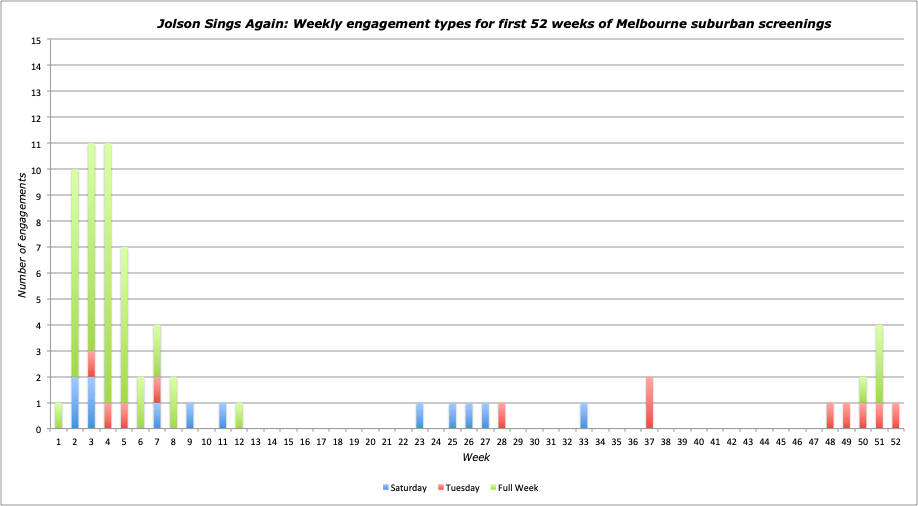 Notes: This was the big one. Number one for EF points (and the only film to crack 500). Number one for engagements (68). Number one for full weeks (44) and Number one for first billings (68). Also number 5 for total slots (44). It looked as though it may only reach a top five EF ranking until Union theatres picked it up late in its run for encore screenings which continued after the 52 week cut-off date. Oddly, for such a well-screened film Jolson didn’t exactly walk a million miles for its audience’s smiles, with a 9,975m average travel per booking placing it only 227th on the chart.