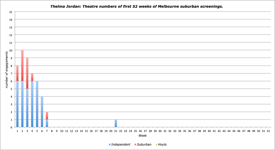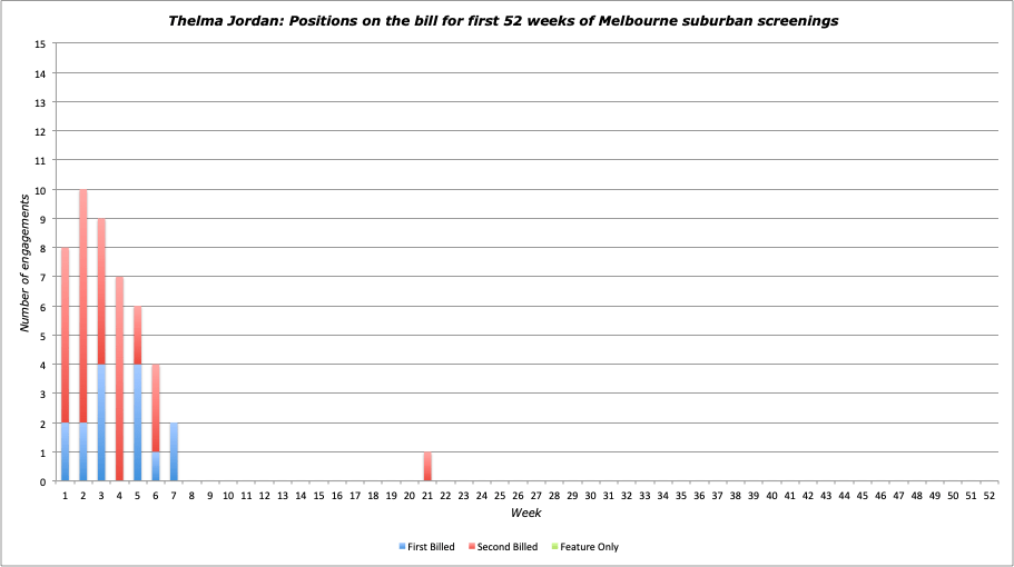 Notes: Paramount noir that had its title shortened for Australian release and played as a support to a re-issue of Duck Soup both in the city and (mostly) suburbs (poor Barbara Stanwyck!). The large number of full weeks had it placing top ten in both categories for weeks, but the hefty number of support roles kept its EF down. Notably, Thelma Jordan and Duck Soup were the only two films to only ever screen together during their first twelve months of suburban release of all 1950 releases.