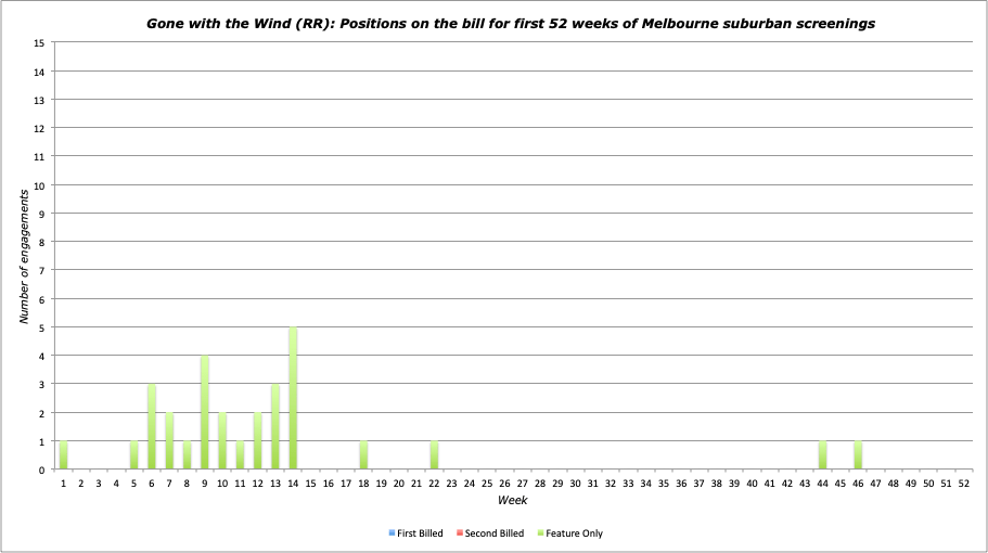 Notes: 29 engagements, each a full week and each a feature only. Thus the reissue of Gone with the Wind ranked #1 for weeks as a % of total engagements and for achieving the perfect EF PPE of 12.00. Other notables were third for feature onlys and fourth for number of slots. Overall a very fine 348 EF points. Clearly, twelve years on audiences still did give a damn…