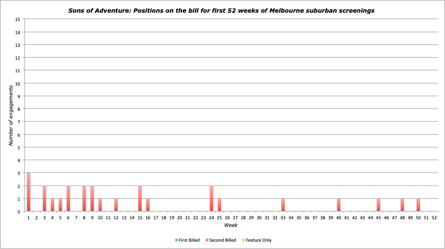 Notes: Republic B-western that ran as a support for a number of features on the Union circuit. Although never consistent in its release pattern, it did have a long shelf life, still being booked out in its 50th week. However, its rankings remained in the basement for most metrics.