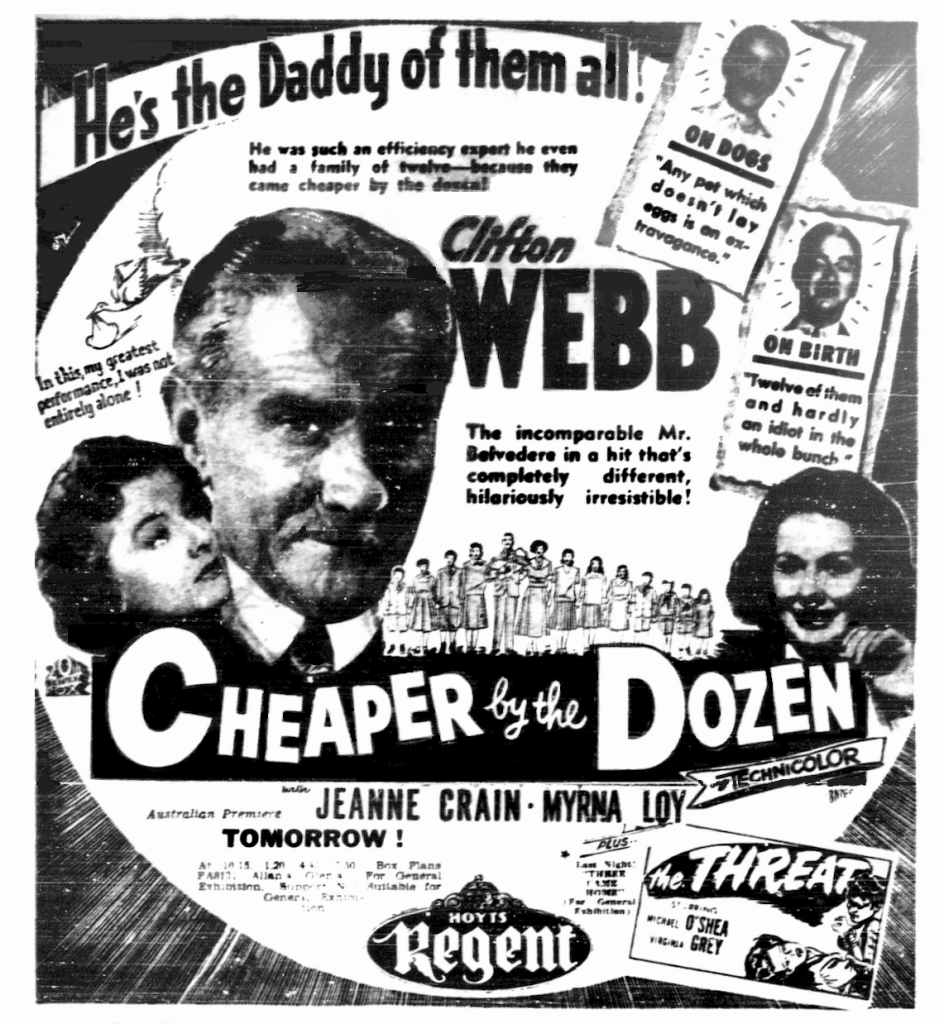 Melbourne Premiere Venue: Hoyts’ Regent Theatre for six weeks from 18 August 1950 supporting Cheaper by the Dozen.