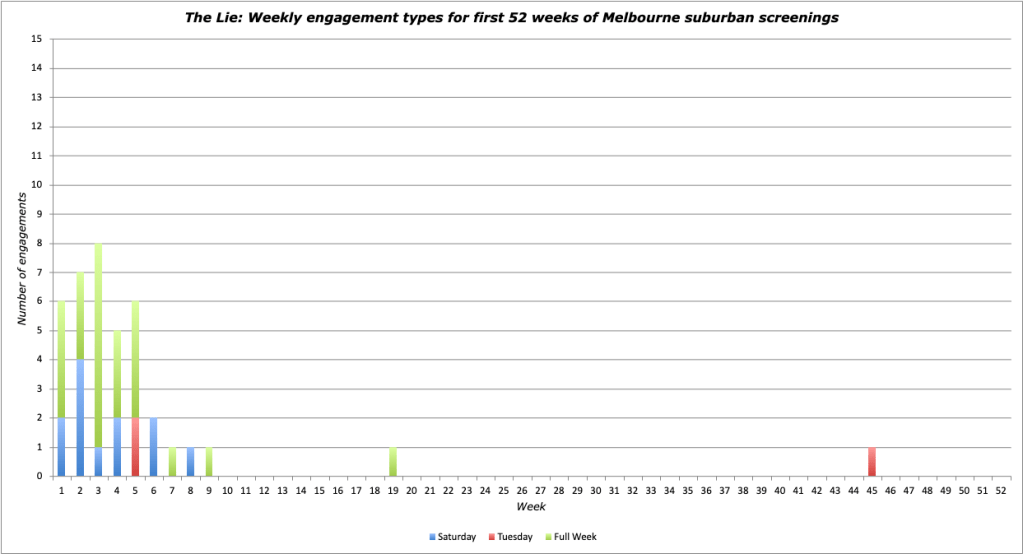 Notes: Fine Paramount noir, an adaptation of Cornell Woolrich’s story, was given a bland retitling for Australian audiences and an inauspicious bow at the Liberty. However, 279 EF points (70th) and a PPE of 7.15 (40th) were decent numbers. Also, its average engagement distance of 11,575m ranked it 18th among all titles that year. A range of features acted as its support.