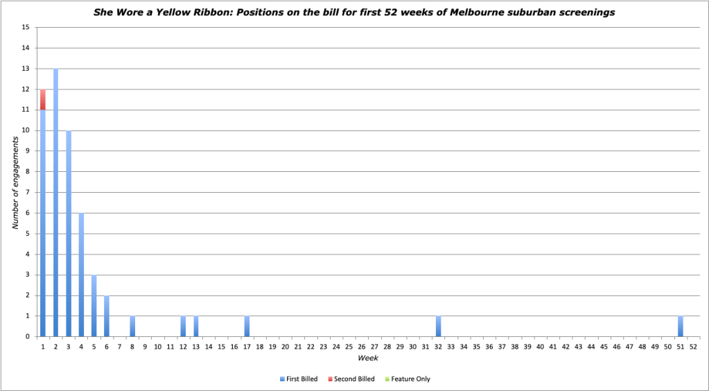 NOTES: Ford’s masterpiece was a mid-level performer for Hoyts coming into Christmas of 1950. Oddly, for a film that had screened as a feature-only engagement at The Capitol for a fortnight Hoyts could not find an exclusive venue for its suburban opening. Instead it was handballed to the Palais as part of a splash opening. Handled better it could have gained a few more points. In most situations it was paired with the British crime drama Third Time Lucky.